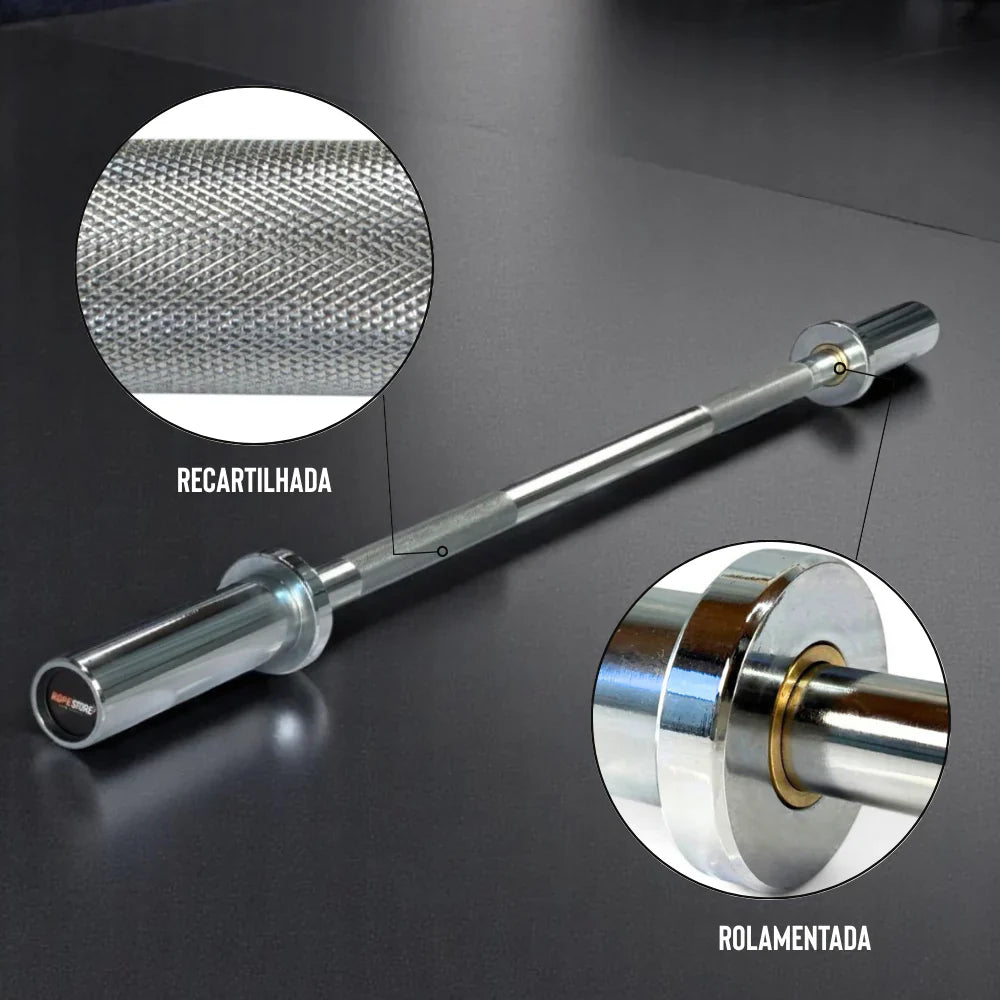 Fabricada em aço cromado de alta resistência, conta com acabamento recartilhado que garante firmeza e segurança mesmo em treinos intensos. Com capacidade para suportar até 272 kg, é indicada tanto para iniciantes quanto para atletas avançados. Compatível com anilhas olímpicas de 50 mm, integra-se facilmente a qualquer estrutura profissional ou home gym. Seu sistema de rolamento de alto desempenho oferece fluidez e conforto, assegurando máxima eficiência na execução dos exercícios.